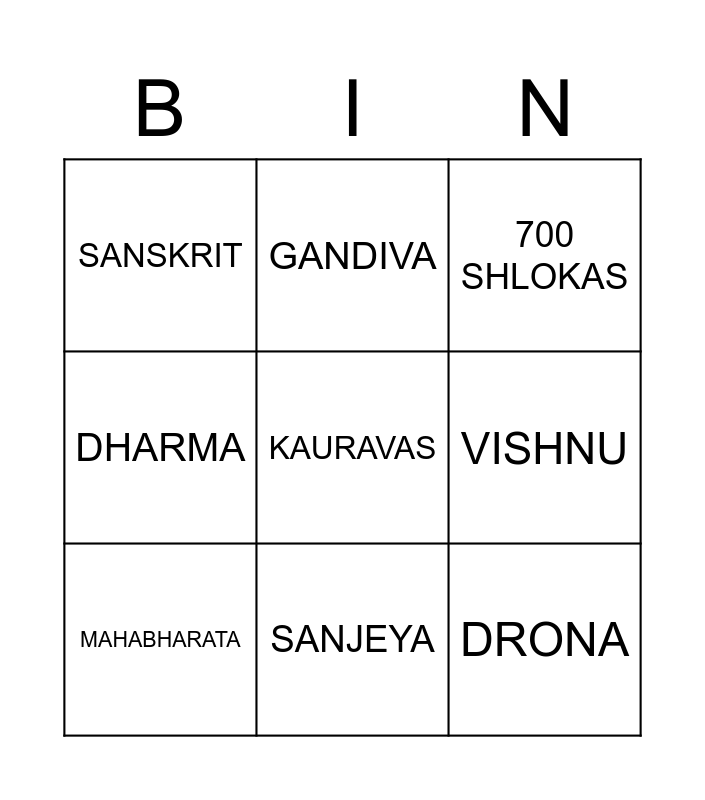 This bingo card has a free space and 19 words: ARJUNA, KRISHNA, 700 SHLOKAS, PANDAVAS, CHARIOTEER, DRONA, DHRITARASHTRA, SANSKRIT, GANDIVA, YUDHISHTRA, DURYODHANA, VISHNU, MAHABHARATA, KUNTI, BHEESHMA, KURUKSHETRA, DHARMA, SANJEYA and WAR.