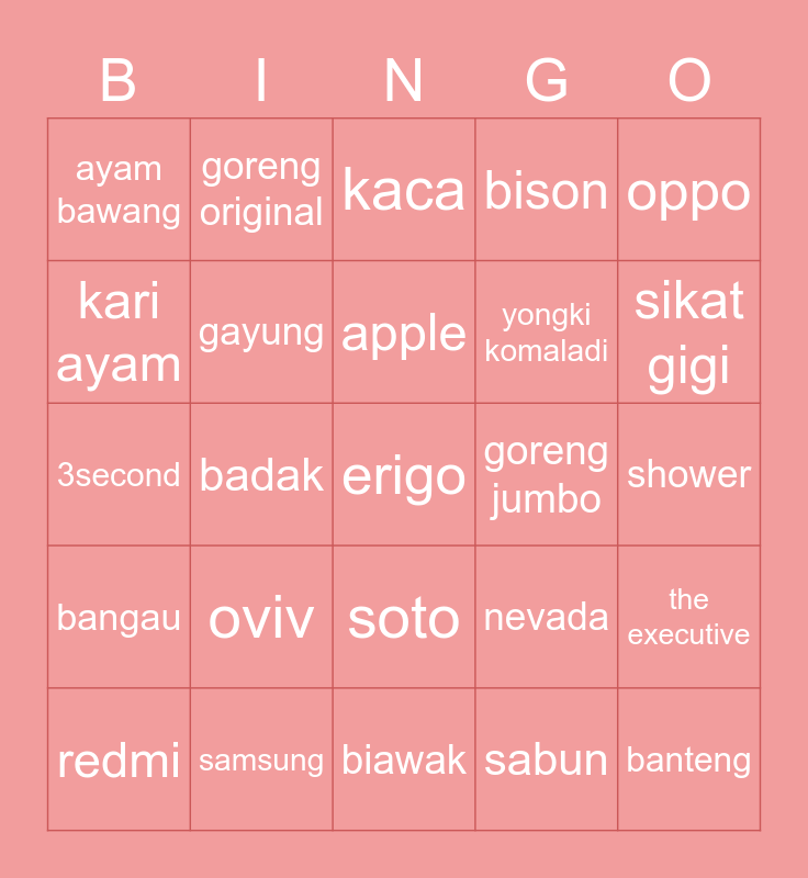 This bingo card has a free space and 24 words: oviv, samsung, apple, redmi, oppo, ayam bawang, kari ayam, goreng original, goreng jumbo, soto, yongki komaladi, 3second, nevada, the executive, gayung, sabun, shower, kaca, sikat gigi, badak, banteng, bangau, bison and biawak.