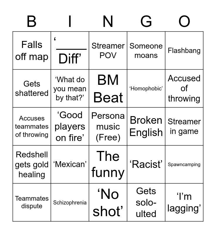 This bingo card has a free space and 24 words: ‘Mexican’, Schizophrenia, BM Beat, Teammates dispute, Flashbang, Falls off map, Gets shattered, ‘____ Diff’, Broken English, The funny, ‘Homophobic’, Accuses teammates of throwing, ‘Racist’, Spawncamping, ‘What do you mean by that?’, Gets solo-ulted, Streamer in game, Streamer POV, Accused of throwing, ‘Good players on fire’, ‘I’m lagging’, Redshell gets gold healing, Someone moans and ‘No shot’.