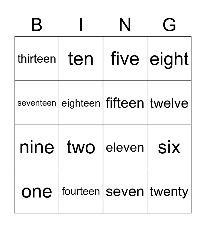 This bingo card has 20 words: one, four, five, six, three, two, seven, eight, nine, ten, eleven, twelve, thirteen, fourteen, fifteen, sixteen, seventeen, eighteen, nineteen and twenty.