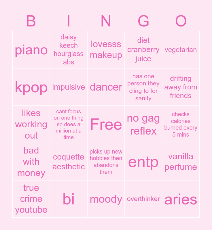This bingo card has a free space and 24 words: coquette aesthetic, bi, dancer, true crime youtube, vegetarian, piano, kpop, daisy keech hourglass abs, no gag reflex, picks up new hobbies then abandons them, has one person they cling to for sanity, likes working out, entp, vanilla perfume, impulsive, overthinker, checks calories burned every 5 mins, lovesss makeup, drifting away from friends, cant focus on one thing so does a million at a time, aries, bad with money, diet cranberry juice and moody.