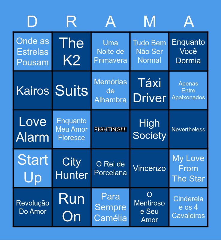 This bingo card has a free space and 49 words: O Rei Eterno, Cinderela e os 4 Cavaleiros, Hotel Del Luna, Para Sempre Camélia, City Hunter, Jardim de Meteoros, The K2, Cheese In The Trap, Kairos, The Penthouse, Suits, Tudo Bem Não Ser Normal, My Love From The Star, Vincenzo, Holo Meu Amor, Hwarang, Memórias de Alhambra, High Society, Herdeiros, Enquanto Você Dormia, Enquanto Meu Amor Floresce, O Mentiroso e Seu Amor, Onde as Estrelas Pousam, Táxi Driver, Flor do Mal, Apenas Entre Apaixonados, Revolução Do Amor, Youth Of may, O Rei de Porcelana, Start Up, Busque: WWW, Melodia da Esperança, Ombro Amigo, Strong Woman Do Boon Soon, Run On, Passarela dos Sonhos, Alice, Hospital Playlist, Nevertheless, Healer, Familiar Wife, Itaewon Class, My Secret Romance, Her Private Life, Love Alarm, Uma Noite de Primavera, My Shy Boss, Kingdom and Oh My Venus.