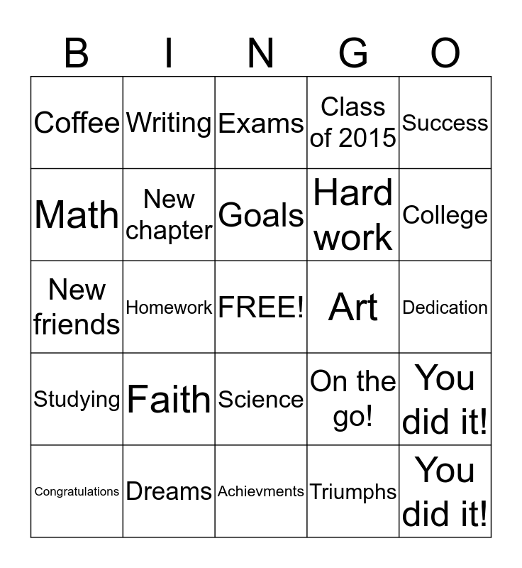 This bingo card has a free space and 24 words: Faith, Dreams, Goals, Congratulations, Success, Coffee, Math, Writing, Art, Science, Hard work, New friends, On the go!, You did it!, New chapter, Triumphs, Dedication, Exams, College, Homework, You did it!, Studying, Class of 2015 and Achievments.