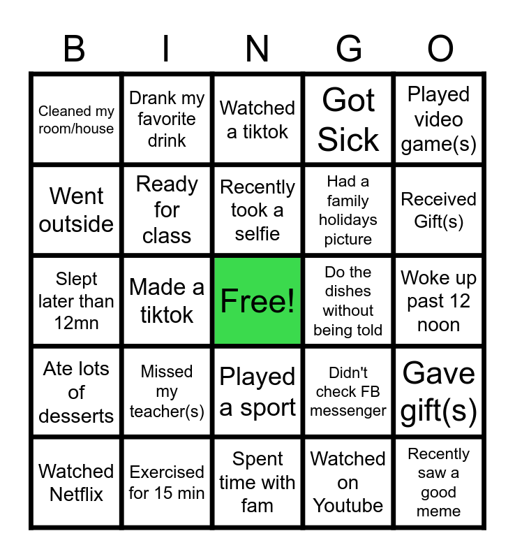 This bingo card has a free space and 24 words: Watched Netflix, Missed my teacher(s), Recently took a selfie, Watched on Youtube, Played video game(s), Cleaned my room/house, Drank my favorite drink, Watched a tiktok, Do the dishes without being told, Woke up past 12 noon, Slept later than 12mn, Ready for class, Didn't check FB messenger, Gave gift(s), Went outside, Exercised for 15 min, Spent time with fam, Got Sick, Received Gift(s), Ate lots of desserts, Made a tiktok, Played a sport, Had a family holidays picture and Recently saw a good meme.