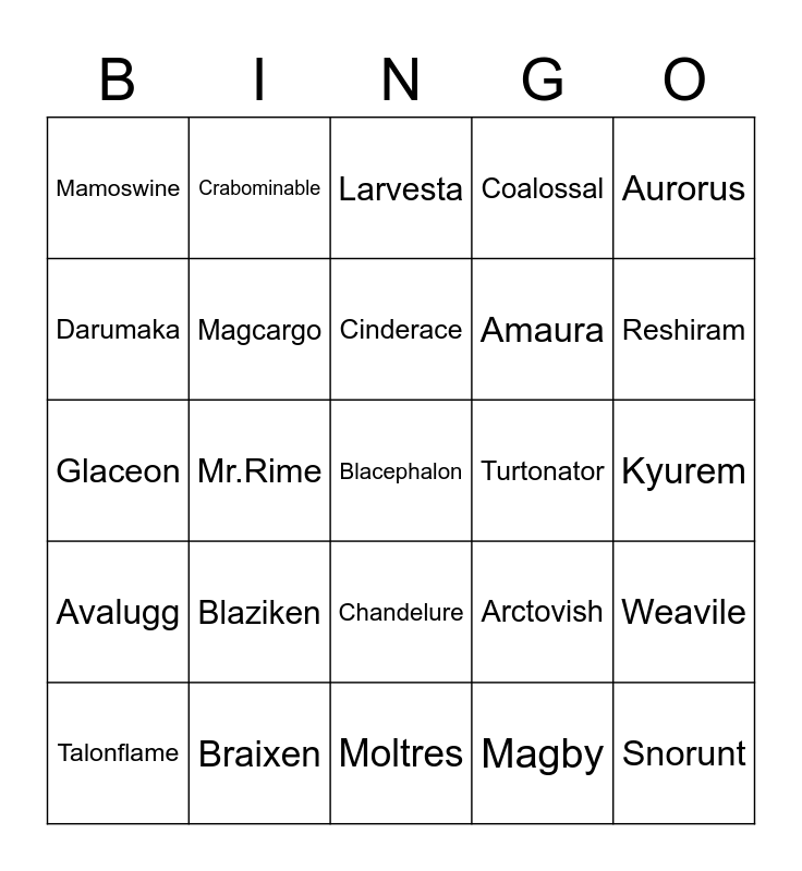 This bingo card has 25 words: Blaziken, Moltres, Cinderace, Talonflame, Aurorus, Mamoswine, Darumaka, Crabominable, Turtonator, Chandelure, Amaura, Glaceon, Arctovish, Weavile, Magcargo, Snorunt, Kyurem, Larvesta, Reshiram, Mr.Rime, Blacephalon, Braixen, Avalugg, Coalossal and Magby.