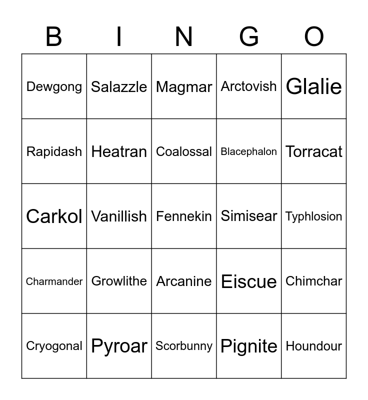 This bingo card has 25 words: Growlithe, Scorbunny, Coalossal, Cryogonal, Glalie, Dewgong, Rapidash, Salazzle, Simisear, Arcanine, Blacephalon, Carkol, Eiscue, Chimchar, Heatran, Houndour, Typhlosion, Magmar, Torracat, Vanillish, Fennekin, Pyroar, Charmander, Arctovish and Pignite.