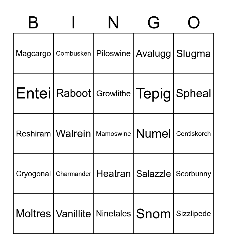 This bingo card has 25 words: Charmander, Ninetales, Growlithe, Moltres, Slugma, Magcargo, Entei, Combusken, Numel, Heatran, Tepig, Reshiram, Salazzle, Scorbunny, Raboot, Sizzlipede, Centiskorch, Piloswine, Spheal, Walrein, Mamoswine, Vanillite, Cryogonal, Avalugg and Snom.