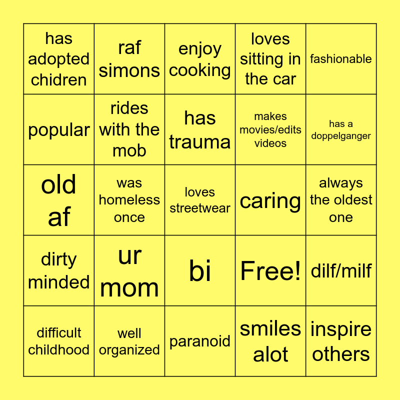 This bingo card has 25 words: ur mom, paranoid, has trauma, difficult childhood, fashionable, has adopted chidren, popular, raf simons, caring, bi, makes movies/edits videos, old af, Free!, dilf/milf, rides with the mob, inspire others, always the oldest one, enjoy cooking, has a doppelganger, was homeless once, loves streetwear, well organized, dirty minded, loves sitting in the car and smiles alot.