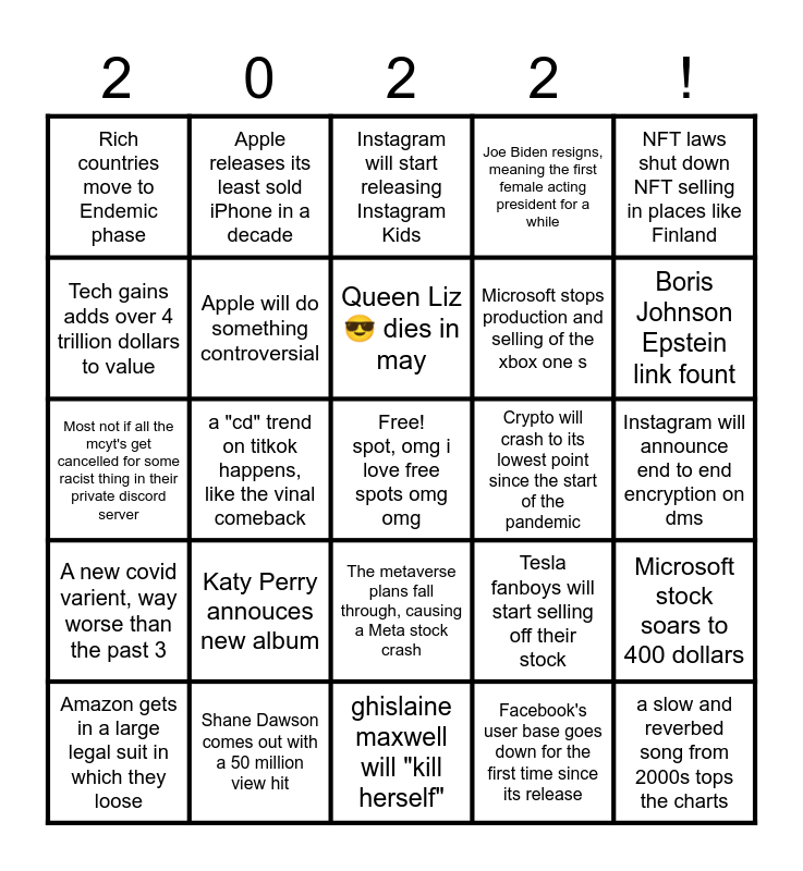This bingo card has a free space and 24 words: Katy Perry annouces new album, Shane Dawson comes out with a 50 million view hit, Queen Liz 😎 dies in may, Amazon gets in a large legal suit in which they loose, NFT laws shut down NFT selling in places like Finland, Rich countries move to Endemic phase, Tech gains adds over 4 trillion dollars to value, Apple releases its least sold iPhone in a decade, Crypto will crash to its lowest point since the start of the pandemic, The metaverse plans fall through, causing a Meta stock crash, Microsoft stops production and selling of the xbox one s, Most not if all the mcyt's get cancelled for some racist thing in their private discord server, Tesla fanboys will start selling off their stock, Microsoft stock soars to 400 dollars, Apple will do something controversial, Facebook's user base goes down for the first time since its release, Instagram will announce end to end encryption on dms, Instagram will start releasing Instagram Kids, Boris Johnson Epstein link fount, a "cd" trend on titkok happens, like the vinal comeback, a slow and reverbed song from 2000s tops the charts, A new covid varient, way worse than the past 3, Joe Biden resigns, meaning the first female acting president for a while and ghislaine maxwell will "kill herself".