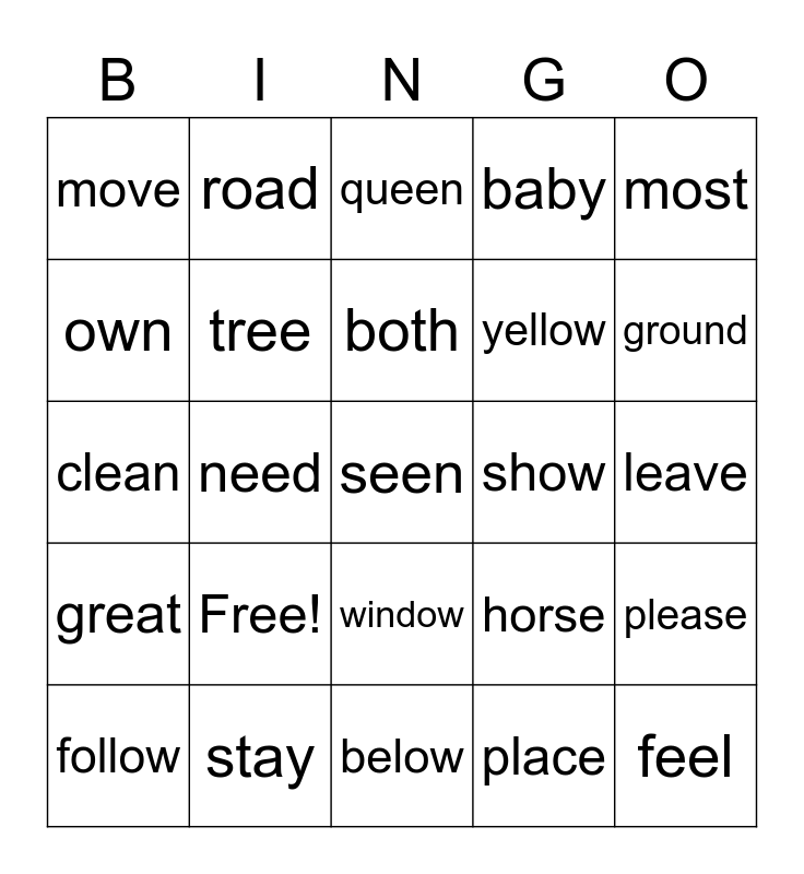 This bingo card has 25 words: Free!, below, both, follow, most, move, own, road, show, window, yellow, clean, horse, please, tree, feel, leave, queen, ground, need, seen, stay, great, baby and place.