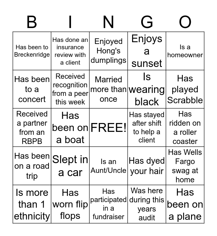 This bingo card has a free space and 24 words: Slept in a car, Has worn flip flops, Married more than once, Is more than 1 ethnicity, Is a homeowner, Has been to Breckenridge, Has been to a concert, Has done an insurance review with a client, Has stayed after shift to help a client, Is an Aunt/Uncle, Is wearing black, Received a partner from an RBPB, Has dyed your hair, Has Wells Fargo swag at home, Received recognition from a peer this week, Was here during this years audit, Has ridden on a roller coaster, Enjoyed Hong's dumplings, Has played Scrabble, Has been on a boat, Has been on a plane, Has been on a road trip, Enjoys a sunset and Has participated in a fundraiser.
