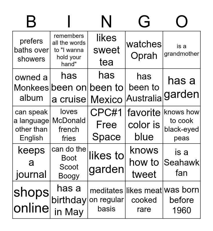 This bingo card has a free space and 24 words: can do the Boot Scoot Boogy, has a birthday in May, has been to Mexico, shops online, is a grandmother, prefers baths over showers, owned a Monkees album, remembers all the words to "I wanna hold your hand", favorite color is blue, likes to garden, has been to Australia, can speak a language other than English, knows how to tweet, is a Seahawk fan, has been on a cruise, likes meat cooked rare, knows how to cook black-eyed peas, likes sweet tea, has a garden, loves McDonald french fries, was born before 1960, keeps a journal, watches Oprah and meditates on regular basis.