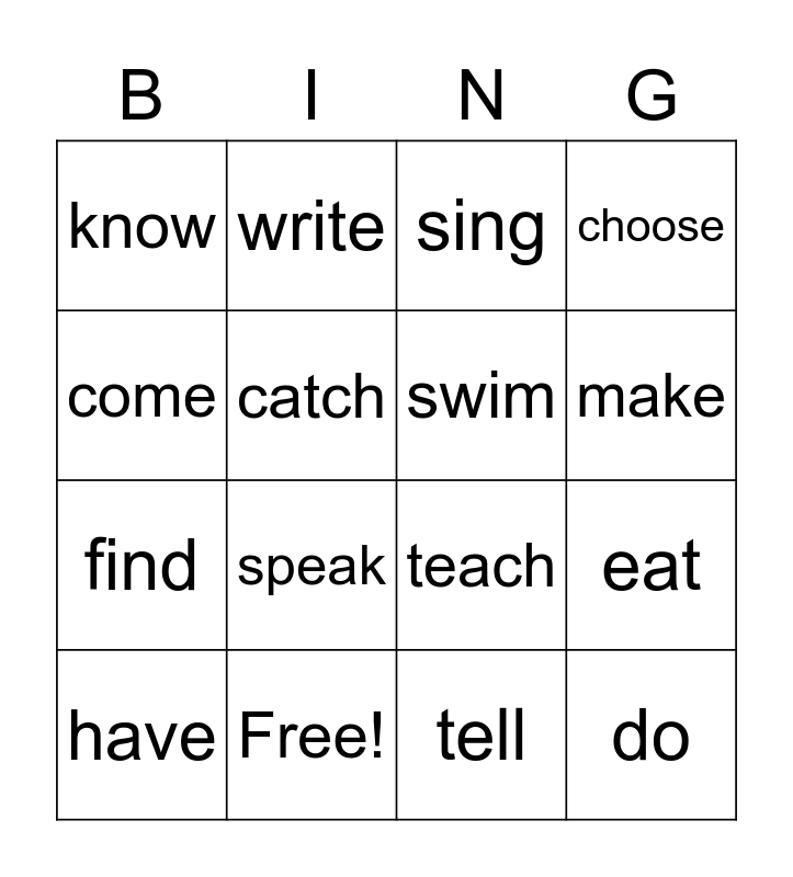 This bingo card has 20 words: eat, be, sing, grow, have, come, Free!, know, find, write, speak, teach, catch, do, swim, sit, make, choose, tell and drive.