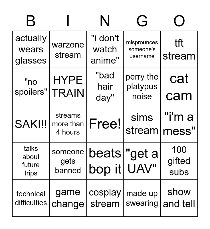 This bingo card has a free space and 24 words: someone gets banned, game change, "bad hair day", technical difficulties, tft stream, actually wears glasses, "no spoilers", warzone stream, sims stream, beats bop it, perry the platypus noise, SAKI!!, "get a UAV", 100 gifted subs, HYPE TRAIN, made up swearing, "i'm a mess", "i don't watch anime", cat cam, streams more than 4 hours, show and tell, talks about future trips, misprounces someone's username and cosplay stream.