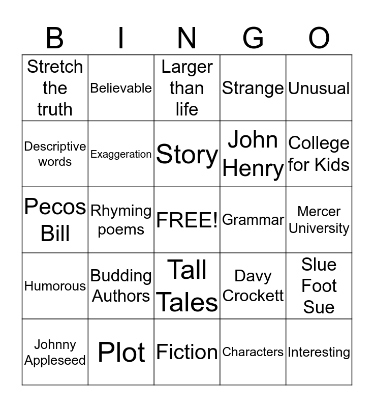 This bingo card has a free space and 26 words: Tall Tales, Characters, Story, Plot, Unusual, Stretch the truth, Descriptive words, Believable, Mercer University, Davy Crockett, John Henry, Pecos Bill, Slue Foot Sue, Johnny Appleseed, Rhyming poems, Acrostic poems, Strange, Humorous, Larger than life, Interesting, College for Kids, Fiction, Grammar, Budding Authors, Exaggeration and Impossible Feats.
