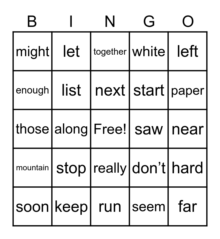 This bingo card has a free space and 100 words: high, every, near, add, food, between, own, below, country, plant, fast, school, father, keep, tree, never, start, city, earth, eye, light, thought, head, under, story, saw, left, don’t, few, while, along, might, chose, something, seem, next, hard, open, example, begin, life, always, those, both, paper, together, got, group, often, run, important, until, children, side, feet, car, mile, night, walk, white, sea, began, grow, took, river, four, carry, state, once, book, hear, stop, without, second, late, miss, idea, enough, eat, face, watch, far, Indian, really, almost, let, above, girl, sometimes, mountain, cut, young, talk, soon, list, song, being, leave, family and it’s.