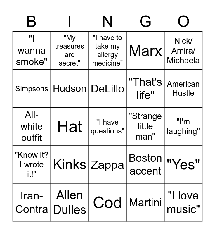 This bingo card has a free space and 24 words: Kinks, Allen Dulles, DeLillo, Iran- Contra, Nick/ Amira/ Michaela, "I wanna smoke", Simpsons, "My treasures are secret", "Strange little man", Zappa, "That's life", All-white outfit, Boston accent, "Yes", Hudson, Martini, "I'm laughing", "I have to take my allergy medicine", American Hustle, Hat, "I love music", "Know it? I wrote it!", Marx and Cod.