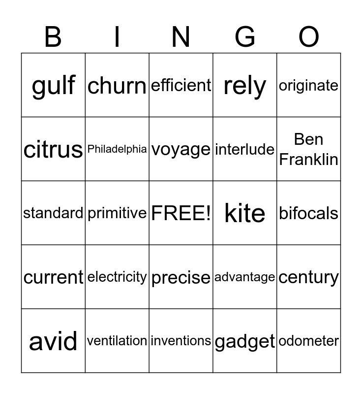 This bingo card has a free space and 26 words: precise, gadget, voyage, ventilation, originate, gulf, citrus, churn, bifocals, advantage, interlude, standard, century, avid, primitive, pivotal, rely, current, efficient, odometer, Ben Franklin, inventions, kite, electricity, Philadelphia and city.