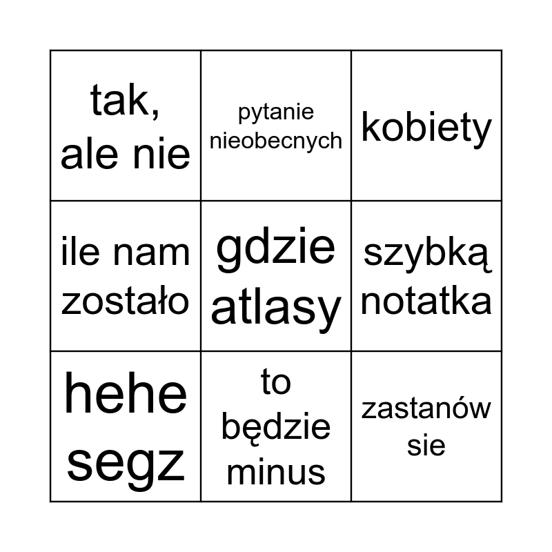 This bingo card has 9 words: hehe segz, kobiety, pytanie nieobecnych, ile nam zostało, tak, ale nie, szybką notatka, gdzie atlasy, zastanów sie and to będzie minus.