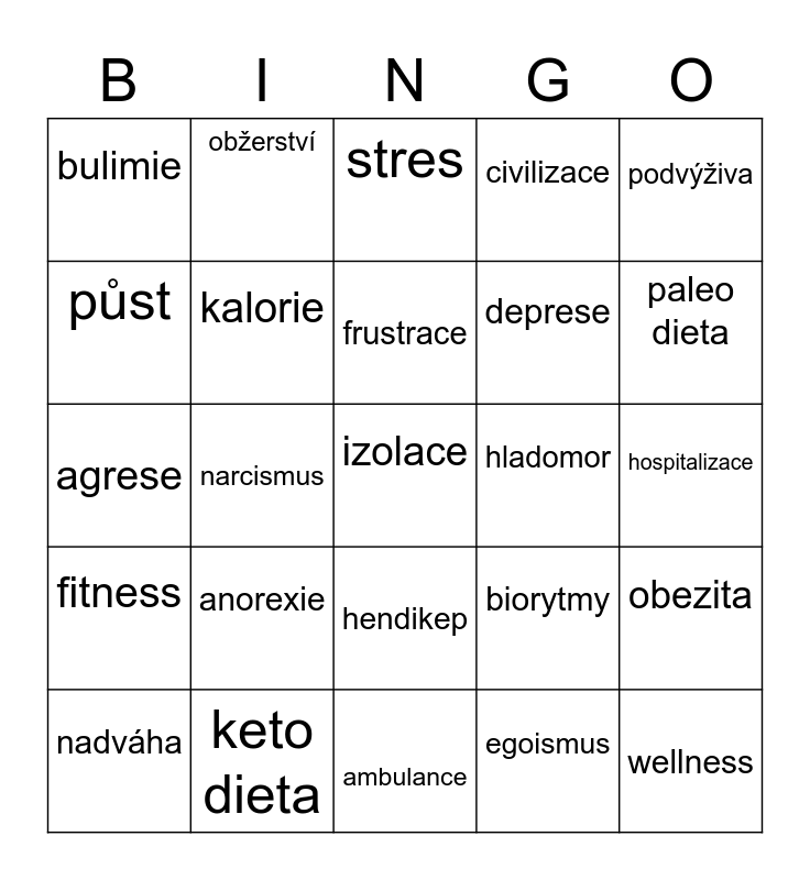 This bingo card has 25 words: anorexie, ambulance, frustrace, nadváha, podvýživa, bulimie, půst, obžerství, hladomor, hendikep, deprese, agrese, biorytmy, obezita, kalorie, wellness, hospitalizace, stres, paleo dieta, narcismus, izolace, keto dieta, fitness, civilizace and egoismus.