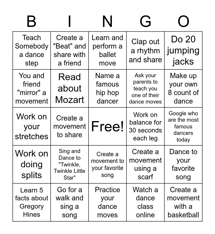This bingo card has a free space and 24 words: Sing and Dance to "Twinkle, Twinkle Little Star", Go for a walk and sing a song, Name a famous hip hop dancer, Learn 5 facts about Gregory Hines, Do 20 jumping jacks, Teach Somebody a dance step, You and friend "mirror" a movement, Create a "Beat" and share with a friend, Work on balance for 30 seconds each leg, Create a movement to your favorite song, Ask your parents to teach you one of their dance moves, Work on your stretches, Create a movement using a scarf, Dance to your favorite song, Read about Mozart, Watch a dance class online, Google who are the most famous dancers today, Learn and perform a ballet move, Make up your own 8 count of dance, Create a movement to share, Create a movement with a basketball, Work on doing splits, Clap out a rhythm and share and Practice your dance moves.