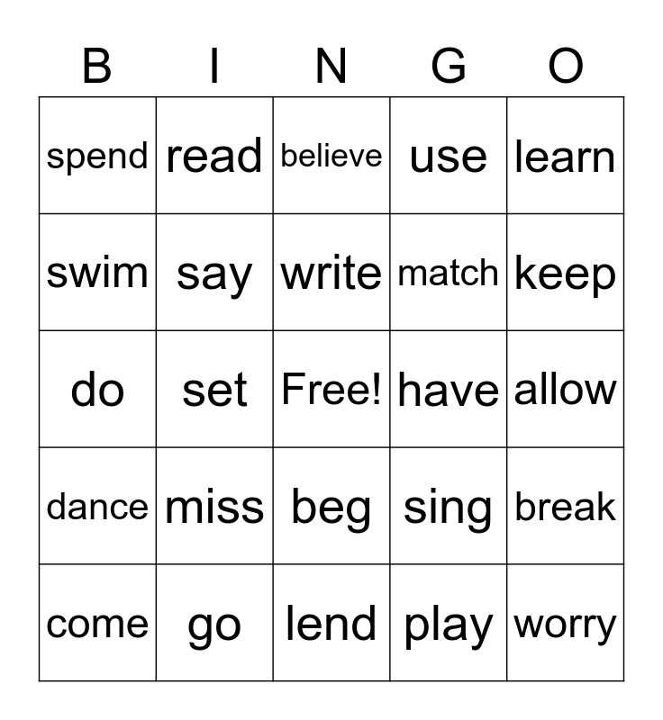 This bingo card has a free space and 34 words: talk, play, conque, see, dance, say, learn, come, read, scream, write, believe, catch, hit, have, keep, go, do, miss, sing, beg, obey, spend, allow, lend, worry, use, get, match, swim, sink, set, break and cling.