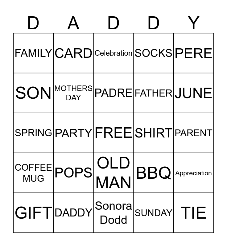 This bingo card has a free space and 24 words: POPS, DADDY, PADRE, GIFT, PERE, FAMILY, SON, CARD, SHIRT, OLD MAN, FATHER, SPRING, BBQ, Appreciation, MOTHERS DAY, SUNDAY, PARENT, Celebration, JUNE, PARTY, TIE, COFFEE MUG, SOCKS and Sonora Dodd.