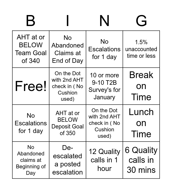 This bingo card has 37 words: De-escalated a posted escalation, AHT at or BELOW Team Goal of 340, AHT at or BELOW Deposit Goal of 350, 10 or more 9-10 T2B Survey's for January, "Words Matter" used on Call; Party ID:, On the Dot with AHT Check in at 1st AHT ( No Cushion Used), Break on Time, No Abandoned Claims at End of Day, Free!, No extended calls for 30 mins (5 min 30 sec), Lunch on Time, 1.5% unaccounted time or less, No Abandoned claims at Beginning of Day, 12 Quality calls in 1 hour, On the Dot with 2nd AHT check in ( No Cushion used), 6 Quality calls in 30 mins, Used given De-escalation given and De-escalated Party ID:, No Escalations for 1 day, T2B at or Above Goal, De-escalated a posted escalation, AHT at or BELOW Team Goal of 340, AHT at or BELOW Deposit Goal of 350, 10 or more 9-10 T2B Survey's for January, "Words Matter" used on Call; Party ID:, On the Dot with AHT Check in at 1st AHT ( No Cushion Used), Break on Time, No Abandoned Claims at End of Day, No extended calls for 30 mins (5 min 30 sec), Lunch on Time, 1.5% unaccounted time or less, No Abandoned claims at Beginning of Day, 12 Quality calls in 1 hour, On the Dot with 2nd AHT check in ( No Cushion used), 6 Quality calls in 30 mins, Used given De-escalation given and De-escalated Party ID:, No Escalations for 1 day and T2B at or Above Goal.