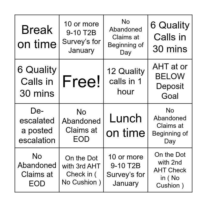 ⚠ This card has duplicate items: AHT at or BELOW Team Goal (3), No Abandoned Claims at EOD (3), No Escalations for 1 day (3), 1.5% Unaccounted time or less (3), On the Dot with 1st AHT Check in ( No Cushion ) (3), On the Dot with 2nd AHT Check in ( No Cushion ) (3), 10 or more 9-10 T2B Survey’s for January (3), AHT at or BELOW Deposit Goal (3), Free! (2), On the Dot with 3rd AHT Check in ( No Cushion ) (3), 12 Quality calls in 1 hour (3), 6 Quality Calls in 30 mins (3), No Abandoned Claims at Beginning of Day (3), Lunch on time (3), Break on time (3), De-escalated a posted escalation (3)