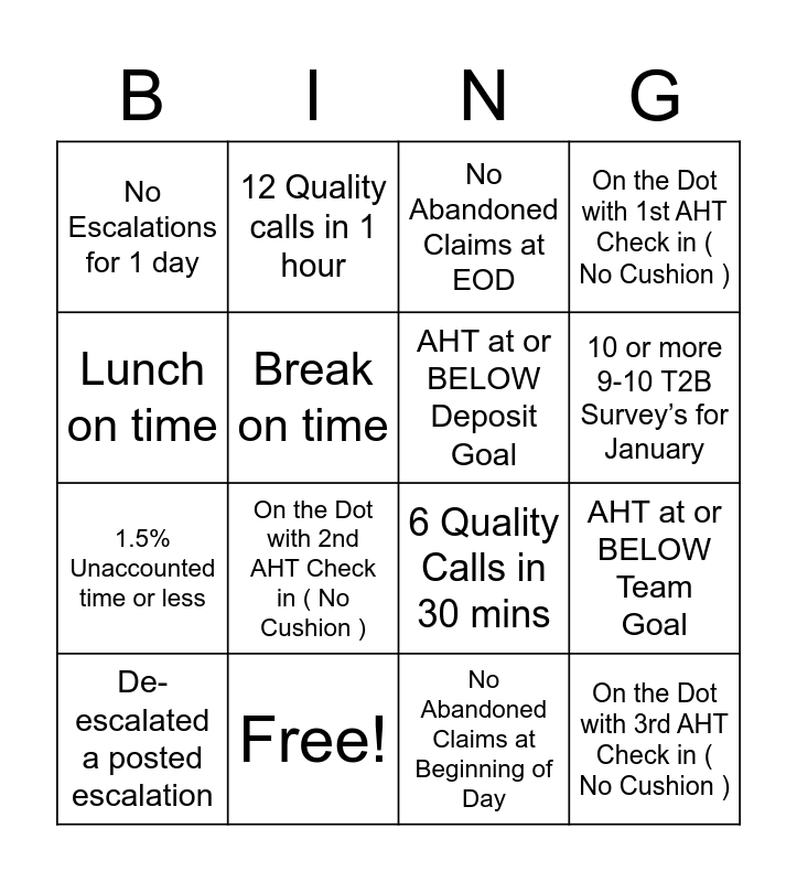 This bingo card has 16 words: Free!, AHT at or BELOW Team Goal, No Abandoned Claims at EOD, No Escalations for 1 day, 1.5% Unaccounted time or less, 12 Quality calls in 1 hour, 6 Quality Calls in 30 mins, No Abandoned Claims at Beginning of Day, Lunch on time, Break on time, De-escalated a posted escalation, On the Dot with 1st AHT Check in ( No Cushion ), On the Dot with 2nd AHT Check in ( No Cushion ), 10 or more 9-10 T2B Survey’s for January, AHT at or BELOW Deposit Goal and On the Dot with 3rd AHT Check in ( No Cushion ).