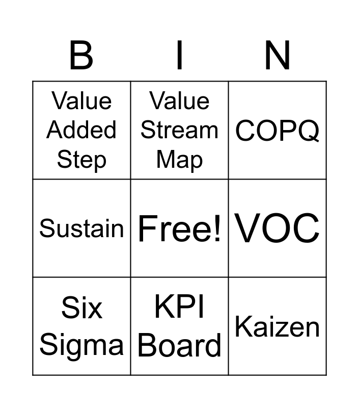 This bingo card has a free space and 14 words: 5S System, Lean, Six Sigma, Value Stream Map, Sustain, Kaizen, DMAIC, OEE, KPI Board, Value Added Step, DPMO, VOC, COPQ and CTQ.