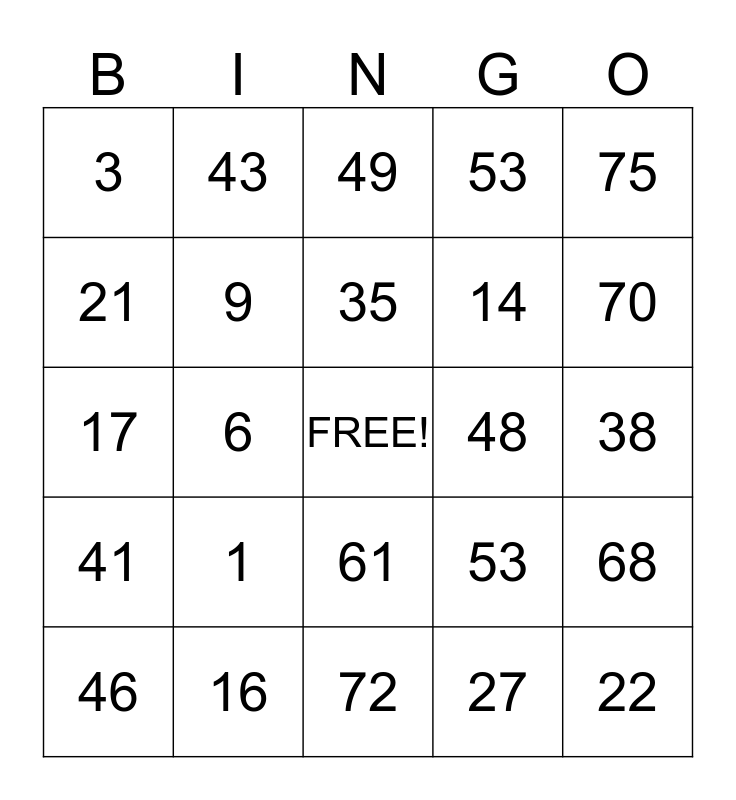 This bingo card has a free space and 24 words: 1, 16, 35, 46, 75, 3, 21, 43, 48, 61, 14, 17, 53, 68, 9, 27, 38, 49, 70, 6, 22, 41, 53 and 72.