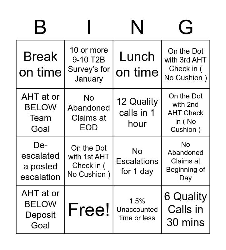 This bingo card has 16 words: Free!, No Abandoned Claims at Beginning of Day, Lunch on time, Break on time, De-escalated a posted escalation, 10 or more 9-10 T2B Survey’s for January, No Escalations for 1 day, 1.5% Unaccounted time or less, AHT at or BELOW Team Goal, No Abandoned Claims at EOD, AHT at or BELOW Deposit Goal, On the Dot with 3rd AHT Check in ( No Cushion ), On the Dot with 1st AHT Check in ( No Cushion ), On the Dot with 2nd AHT Check in ( No Cushion ), 12 Quality calls in 1 hour and 6 Quality Calls in 30 mins.