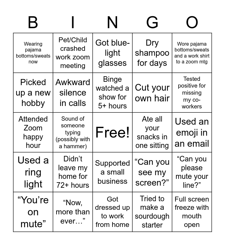 This bingo card has a free space and 25 words: Didn’t leave my home for 72+ hours, Got dressed up to work from home, Binge watched a show for 5+ hours, “You’re on mute”, Wore pajama bottoms/sweats and a work shirt to a zoom mtg, Wearing pajama bottoms/sweats now, Picked up a new hobby, Pet/Child crashed work zoom meeting, Ate all your snacks in one sitting, Supported a small business, Cut your own hair, Attended Zoom happy hour, “Can you see my screen?”, “Can you please mute your line?”, Awkward silence in calls, “My internet is slow”, Used an emoji in an email, Got blue-light glasses, Tested positive for missing my co-workers, Sound of someone typing (possibly with a hammer), Full screen freeze with mouth open, “Now, more than ever…”, Used a ring light, Dry shampoo for days and Tried to make a sourdough starter.