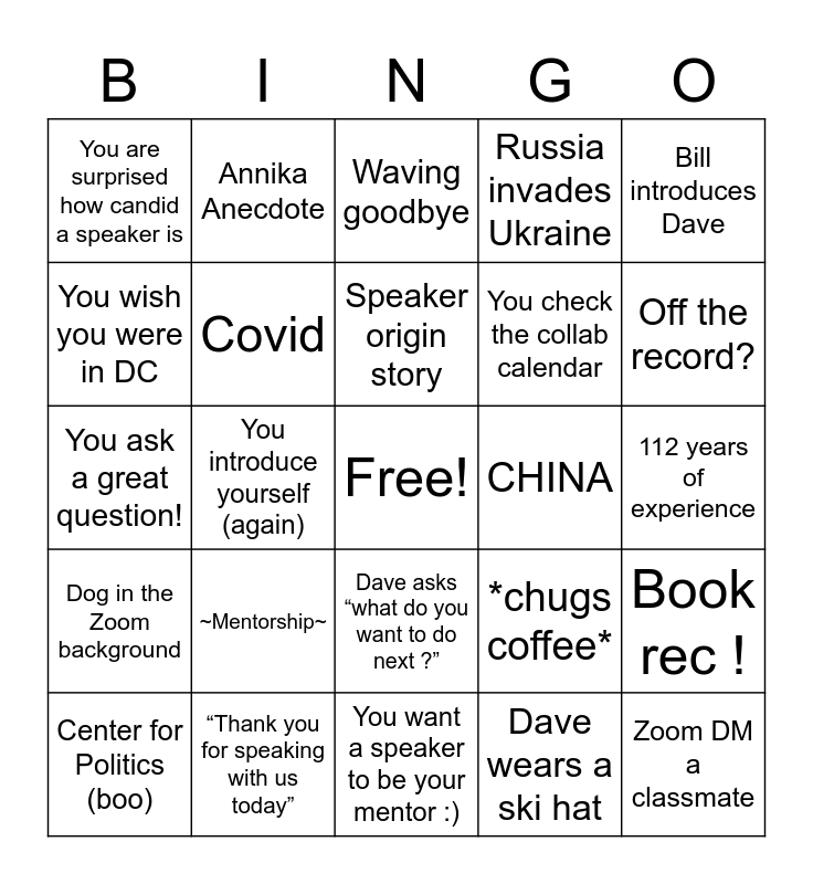 This bingo card has a free space and 24 words: ~Mentorship~, “Thank you for speaking with us today”, Speaker origin story, Center for Politics (boo), Bill introduces Dave, You are surprised how candid a speaker is, You wish you were in DC, Annika Anecdote, CHINA, Dave asks “what do you want to do next ?”, You check the collab calendar, You ask a great question!, *chugs coffee*, Book rec !, Covid, Dave wears a ski hat, 112 years of experience, Waving goodbye, Off the record?, You introduce yourself (again), Zoom DM a classmate, Dog in the Zoom background, Russia invades Ukraine and You want a speaker to be your mentor :).