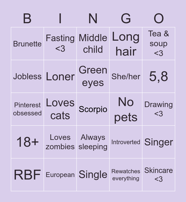 This bingo card has a free space and 24 words: Loves zombies, European, Green eyes, RBF, Tea & soup <3, Brunette, Jobless, Fasting <3, No pets, Always sleeping, She/her, Pinterest obsessed, Introverted, Singer, Loner, Rewatches everything, Drawing <3, Middle child, 5,8, Loves cats, Skincare <3, 18+, Long hair and Single.