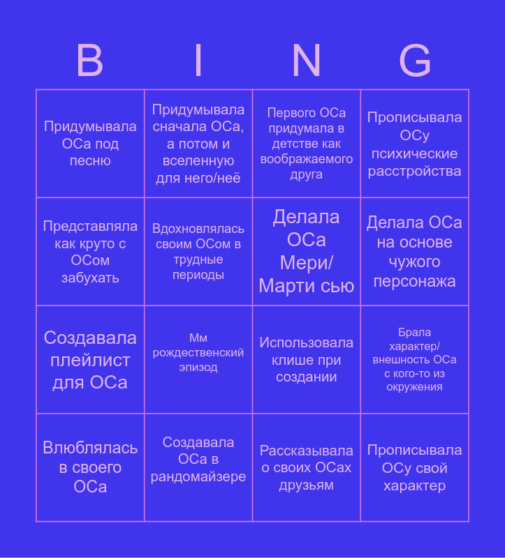 This bingo card has 16 words: Создавала ОСа в рандомайзере, Брала характер/внешность ОСа с кого-то из окружения, Первого ОСа придумала в детстве как воображаемого друга, Придумывала ОСа под песню, Создавала плейлист для ОСа, Придумывала сначала ОСа, а потом и вселенную для него/неё, Использовала клише при создании, Рассказывала о своих ОСах друзьям, Представляла как круто с ОСом забухать, Вдохновлялась своим ОСом в трудные периоды, Влюблялась в своего ОСа, Прописывала ОСу психические расстройства, Мм рождественский эпизод, Делала ОСа на основе чужого персонажа, Делала ОСа Мери/Марти сью and Прописывала ОСу свой характер.