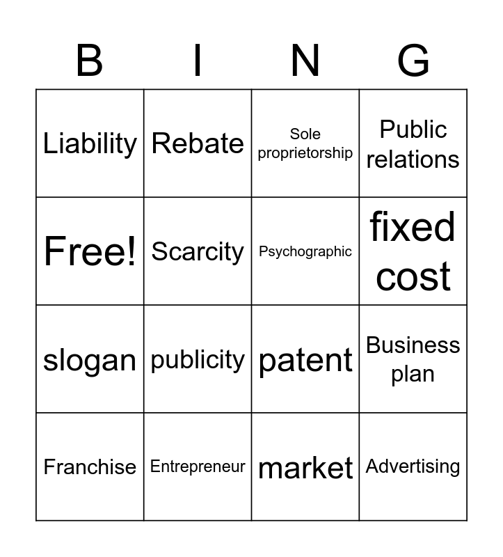 This bingo card has 16 words: Entrepreneur, Business plan, Sole proprietorship, Liability, slogan, Rebate, patent, market, Free!, Scarcity, Franchise, Public relations, publicity, fixed cost, Psychographic and Advertising.