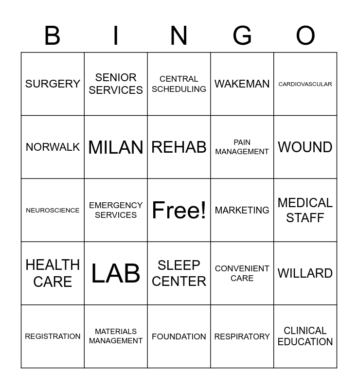 This bingo card has a free space and 49 words: CENTRAL STAFFING, CLINICAL EDUCATION, EVS, FOUNDATION, LAB, OCCUPATIONAL HEALTH, SENIOR SERVICES, PAC, NORWALK, NEW LONDON, MILAN, WAKEMAN, WILLARD, CONVENIENT CARE, ONCOLOGY, NURSING, REHAB, MARKETING, IMAGING, CARDIOVASCULAR, EMERGENCY SERVICES, RESPIRATORY, SURGERY, PAIN MANAGEMENT, MATERNITY, WOUND, REGISTRATION, QUALITY, SLEEP CENTER, HEALTH CARE, FISHER-TITUS, NUTRITION SERVICES, INFORMATION SERVICES, TRAUMA SERVICES, MATERIALS MANAGEMENT, NCEMS, HIM, MEDICAL CARE, MEDICAL STAFF, HOME HEALTH, PHARMACY, SECURITY, COMPLIANCE, POPULATION HEALTH, NEUROSCIENCE, CENTRAL SCHEDULING, FACILITIES, FINANCE and MEDICINE.