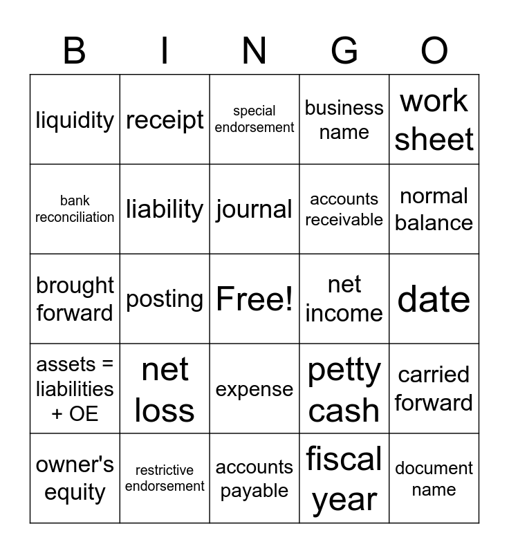 This bingo card has a free space and 39 words: debit, credit, asset, liability, owner's equity, expense, journal, general ledger, work sheet, assets = liabilities + OE, posting, business name, document name, date, net income, net loss, adjustment, liquidity, alphabetical, petty cash, bank reconciliation, accounts payable, accounts receivable, normal balance, drawing, capital, check, memorandum, calculator tape, receipt, invoice, blank endorsement, special endorsement, restrictive endorsement, fiscal year, fiscal period, carried forward, brought forward and proving cash.