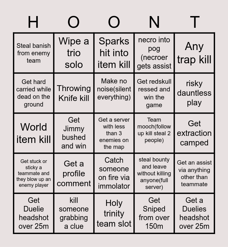This bingo card has 32 words: Get Sniped from over 150m, derringer kill, Get Jimmy bushed and win, Get 4th partied, Get stuck or sticky a teammate and they blow up an enemy player, Throwing Knife kill, Any trap kill, Get an assist via anything other than teammate, Wipe a trio solo, Get a Duelies headshot over 25m, Make no noise(silent everything), Sparks hit into item kill, Cucka card(Deny bingo slot), Successfully negotiate a peace treaty(all get bingo slot), Team mooch(follow up kill steal 2 people), Concertina Bomb kill, Get Duelie headshot over 25m, World item kill, Catch someone on fire via immolator, Get a profile comment, steal bounty and leave without killing anyone(full server), Get down mr president( die protecting your teammate), Get extraction camped, kill someone grabbing a clue, Get a server with less than 3 enemies on the map, necro into pog (necroer gets assist, Get redskull ressed and win the game, Get hard carried while dead on the ground, Steal banish from enemy team, Holy trinity team slot, outsnipe a sniper and risky dauntless play.