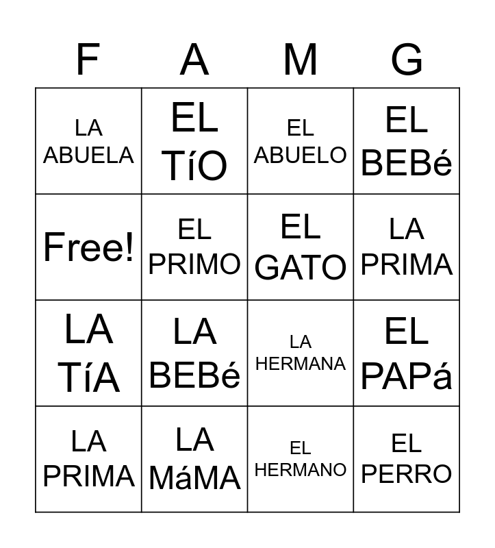 This bingo card has 16 words: LA MáMA, EL PAPá, EL ABUELO, LA ABUELA, LA TíA, EL TíO, LA HERMANA, EL HERMANO, Free!, EL PRIMO, LA PRIMA, EL BEBé, LA BEBé, LA PRIMA, EL GATO and EL PERRO.