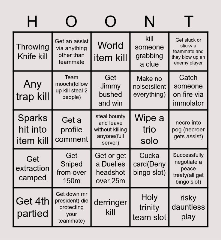 This bingo card has 25 words: Get Sniped from over 150m, derringer kill, Get Jimmy bushed and win, Get 4th partied, Get stuck or sticky a teammate and they blow up an enemy player, Throwing Knife kill, Any trap kill, Get an assist via anything other than teammate, Wipe a trio solo, Get or get a Duelies headshot over 25m, Make no noise(silent everything), Sparks hit into item kill, Cucka card(Deny bingo slot), Successfully negotiate a peace treaty(all get bingo slot), Team mooch(follow up kill steal 2 people), risky dauntless play, necro into pog (necroer gets assist), World item kill, Catch someone on fire via immolator, Get a profile comment, steal bounty and leave without killing anyone(full server), Get down mr president( die protecting your teammate), Get extraction camped, kill someone grabbing a clue and Holy trinity team slot.