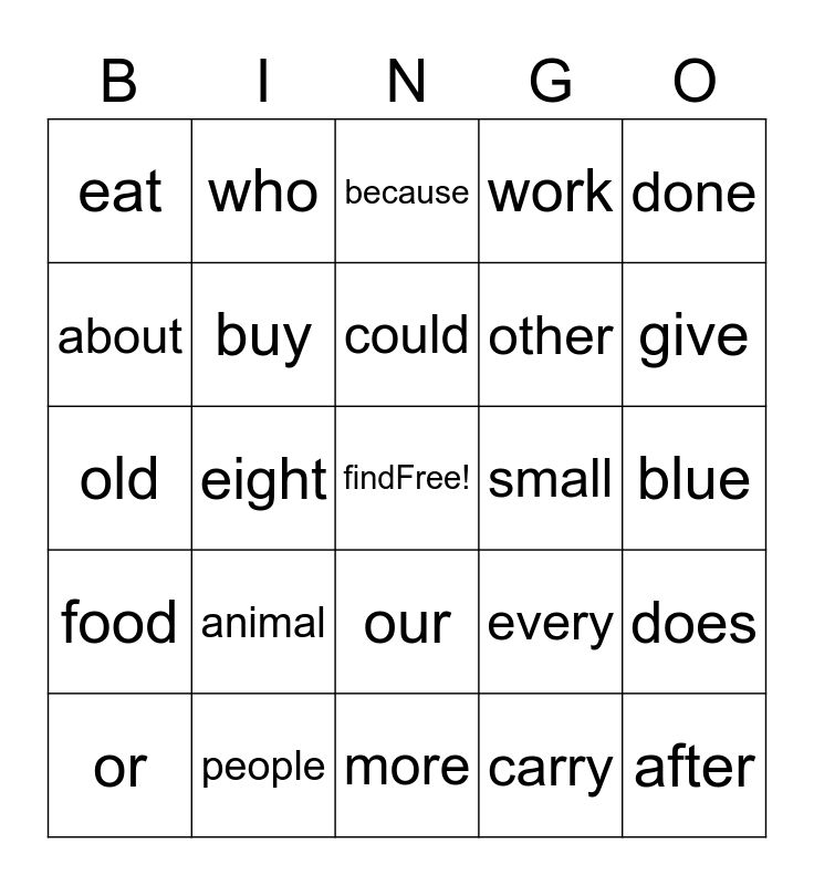 This bingo card has a free space and 29 words: or, into, eight, find, eat, because, buy, animal, small, people, blue, after, more, carry, give, soon, our, food, done, old, every, how, other, about, work, who, does, could and use.