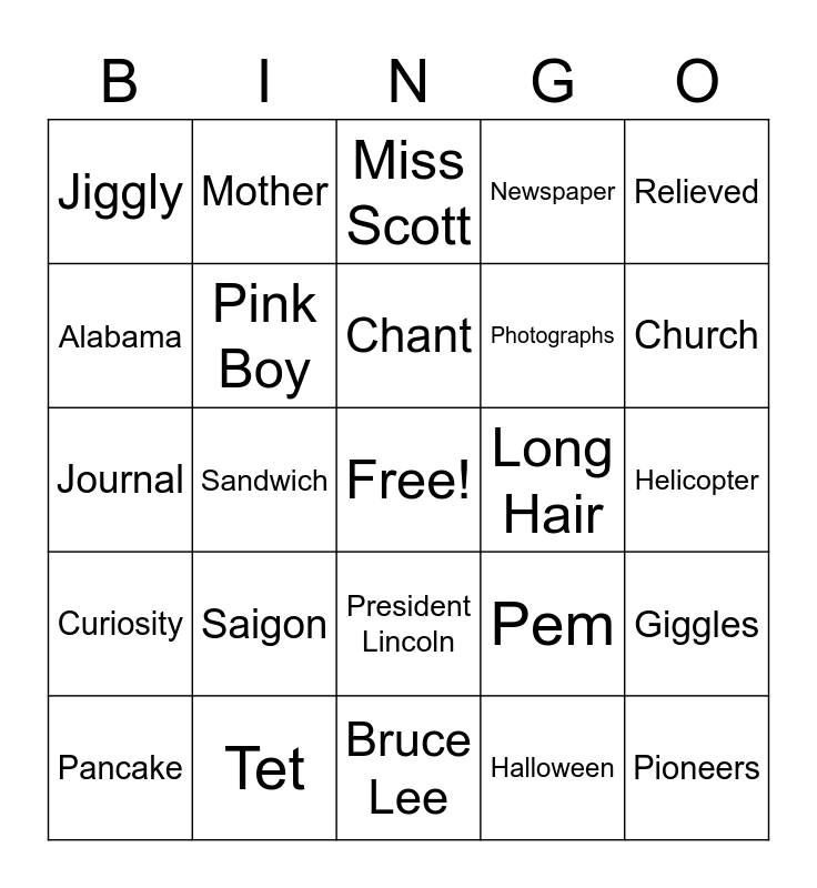 This bingo card has a free space and 32 words: Halloween, War, Sandwich, Laughter, Curiosity, Pink Boy, Relieved, Giggles, Mother, Eyelashes, Chant, Miss Scott, Multiply, Barrettes, Long Hair, Ribbons, Pancake, Journal, President Lincoln, Saigon, Pem, Neighbors, Helicopter, Tet, Pioneers, Newspaper, Photographs, Alabama, Jiggly, Bruce Lee, Coconut-Shell Skin and Church.