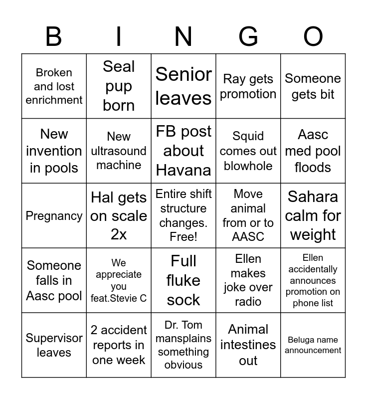 This bingo card has a free space and 24 words: We appreciate you feat.Stevie C, 2 accident reports in one week, FB post about Havana, Supervisor leaves, Someone gets bit, Broken and lost enrichment, New invention in pools, Seal pup born, Move animal from or to AASC, Full fluke sock, Squid comes out blowhole, Pregnancy, Ellen makes joke over radio, Ellen accidentally announces promotion on phone list, New ultrasound machine, Animal intestines out, Sahara calm for weight, Senior leaves, Aasc med pool floods, Hal gets on scale 2x, Beluga name announcement, Someone falls in Aasc pool, Ray gets promotion and Dr. Tom mansplains something obvious.