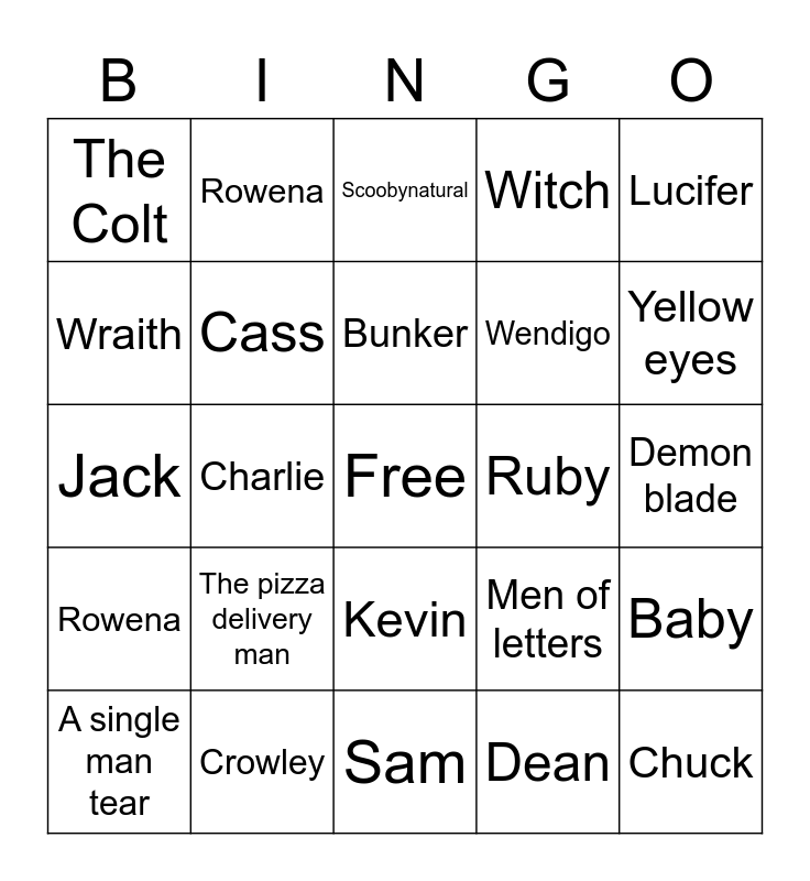 This bingo card has a free space and 29 words: A single man tear, Supernatural, Charlie, Wayward son, The Colt, Scoobynatural, Cass, The pizza delivery man, Ruby, Crowley, Demon blade, Chuck, Sam, Dean, Yellow eyes, Death, Kevin, Rowena, Lucifer, Jack, Men of letters, Garth, Wendigo, Wraith, Witch, Rowena, Baby, Bunker and Pie.