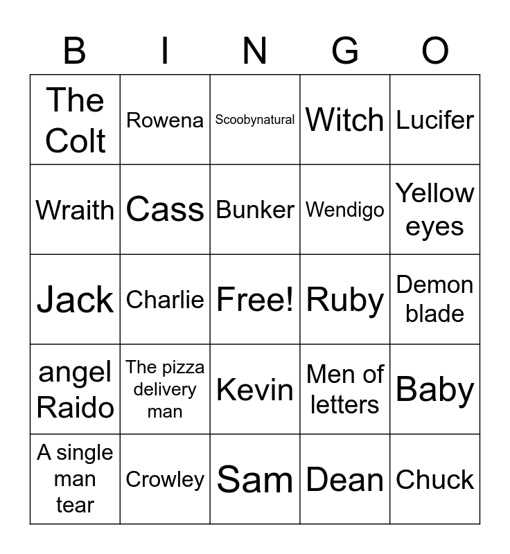 This bingo card has a free space and 29 words: A single man tear, Supernatural, Charlie, Wayward son, The Colt, Scoobynatural, Cass, The pizza delivery man, Ruby, Crowley, Demon blade, Chuck, Sam, Dean, Yellow eyes, Death, Kevin, angel Raido, Lucifer, Jack, Men of letters, Garth, Wendigo, Wraith, Witch, Rowena, Baby, Bunker and Pie.