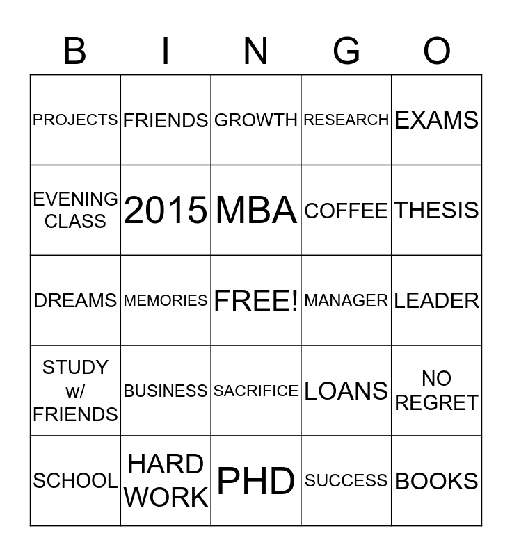 This bingo card has a free space and 24 words: BUSINESS, HARD WORK, MBA, SCHOOL, EXAMS, PROJECTS, EVENING CLASS, FRIENDS, MANAGER, SACRIFICE, COFFEE, DREAMS, LOANS, NO REGRET, 2015, SUCCESS, LEADER, GROWTH, THESIS, MEMORIES, BOOKS, STUDY w/ FRIENDS, RESEARCH and PHD.