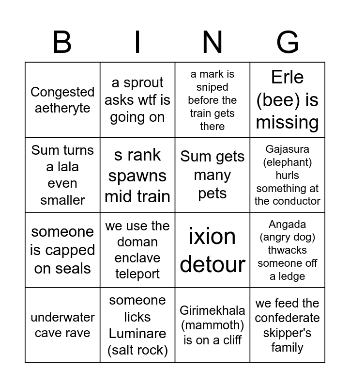 This bingo card has 16 words: someone licks Luminare (salt rock), Angada (angry dog) thwacks someone off a ledge, a mark is sniped before the train gets there, Congested aetheryte, someone is capped on seals, a sprout asks wtf is going on, ixion detour, Girimekhala (mammoth) is on a cliff, Sum turns a lala even smaller, s rank spawns mid train, underwater cave rave, Erle (bee) is missing, we use the doman enclave teleport, Gajasura (elephant) hurls something at the conductor, Sum gets many pets and we feed the confederate skipper's family.